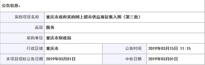 2019年3月15日,我公司以雄厚的技術力量和良好的企業信譽,通過層層篩選,入圍重慶市政府采購網上超市供應商征集入圍(第三批)